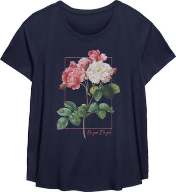 - Strut your stuff with this stylish new women's plus size scoop hem t-shirt that is perfect for every occasion! Featuring pretty white and pink flowers along with the text: "Be Good Do Good" printed below in white script font.