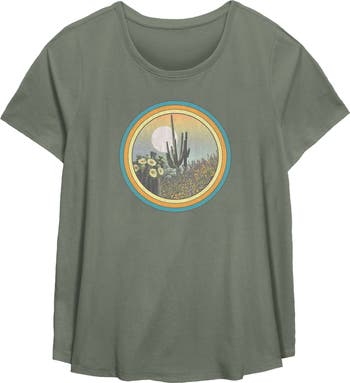 - Strut your stuff with this stylish new women's plus size scoop hem t-shirt that is perfect for every occasion! Featuring a vintage graphic of the picture of a desert inside a colorful circular frame.