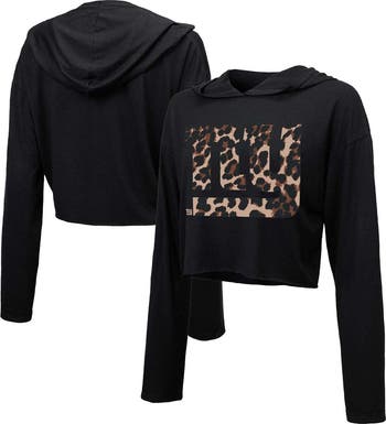 The Women's Majestic Threads Black New York Giants Leopard Cropped Pullover Hoodie is the perfect way to show your support for the New York Giants. This lightweight hoodie is made from a soft rayon and spandex blend, making it comfortable to wear all day. The cropped design and dropped shoulders give it a stylish look, while the hood without a drawstring keeps you warm without being bulky. The screen print graphics with sublimated design feature the New York Giants logo, so you can show your team spirit wherever you go.