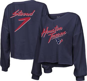 Women's Majestic Threads C.J. Stroud Navy Houston Texans Name & Number Script Off-Shoulder Cropped Long Sleeve T-Shirt