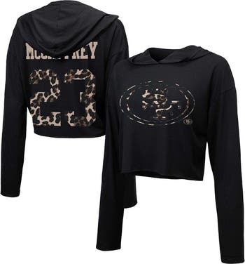 The Women's Majestic Threads Christian McCaffrey Black San Francisco 49ers Leopard Player Name & Number Long Sleeve Cropped Hoodie is the perfect way to show your support for the San Francisco 49ers. With its screen-printed graphics and dropped shoulders, this hoodie is both stylish and comfortable. The cropped, unfinished hem gives it a modern look, while the rayon and spandex material ensures breathability and easy wear. Whether you're cheering on the 49ers from the stands or relaxing at home, this hoodie is sure to become a favorite.