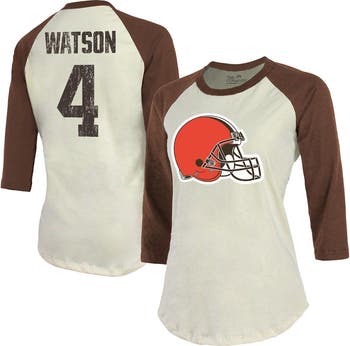 Women's Majestic Threads Deshaun Watson Cream/Brown Cleveland Browns Name & Number Raglan 3/4 Sleeve T-Shirt