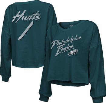 Women's Majestic Threads Jalen Hurts Green Philadelphia Eagles Name & Number Off-Shoulder Script Cropped Long Sleeve V-Neck T-Shirt