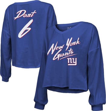 Show your favorite New York Giants player some love in chic fashion with this Jaxson Dart Script Name & Number Long Sleeve T-Shirt from Majestic Threads. The printed graphics in a distressed design feature New York Giants script on the front and his name and number displayed across the back. A cropped hem completes the stylish look of this Jaxson Dart top.