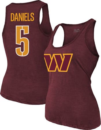 Cheer on the Washington Commanders with this Jayden Daniels Name & Number Tri-Blend Scoop Neck Tank Top from Majestic Threads. The screen print logo on the front adds a vintage vibe, while the player name and number on the back let everyone know you're a dedicated Jayden Daniels fan. Crafted from a super-soft tri-blend fabric, this tank top will keep you cool and comfortable whether you're at the game or out and about.