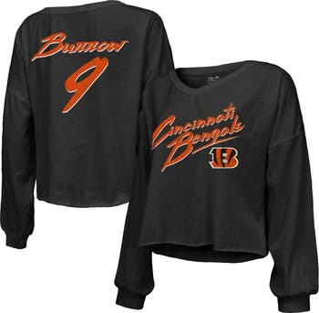 Women's Majestic Threads Joe Burrow Black Cincinnati Bengals Name & Number Off-Shoulder Script Cropped Long Sleeve V-Neck T-Shirt