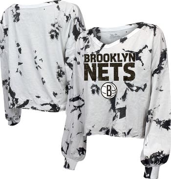 Women's Majestic Threads White/Black Brooklyn Nets Aquarius Tie-Dye Cropped V-Neck Long Sleeve T-Shirt