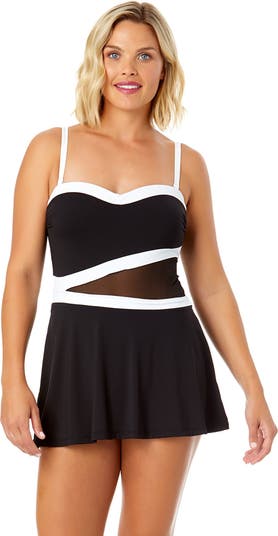 Step out in confidence with our Mesh Around Paneled Strapless Mesh Swim Dress, a sleek and stylish choice for sunny days. The paneled design with mesh accents creates a sophisticated, eye-catching look, while the strapless neckline adds a refined touch. Molded sewn-in cups offer gentle support, and adjustable straps allow for a customizable fit. The flared skirt provides extra coverage and a flowy silhouette, perfect for beachside strolls or poolside lounging. Pair it with simple accessories for a polished summer outfit. Model wearing a size 6