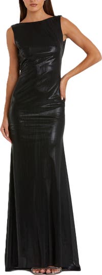 Crafted from sleek jersey fabric, this gown features a high neckline, cowl open back, and cascading ruffle detail for an elegant and sophisticated look.