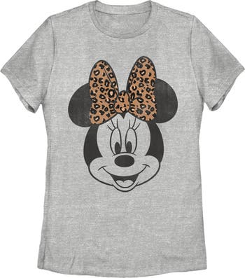 - Own the moment with this stylish new everyday Women's T-Shirt that is perfect for every occasion! Featuring a Minnie Mouse portrait with a cheetah print bow.
