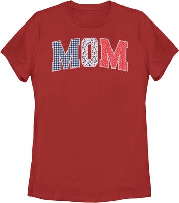 - Add a bit of magic to your mom's day with this stylish new women's t-shirt! Featuring a college-themed graphic of the word: "Mom" with different red, blue, and white patterns decorating each letter.
