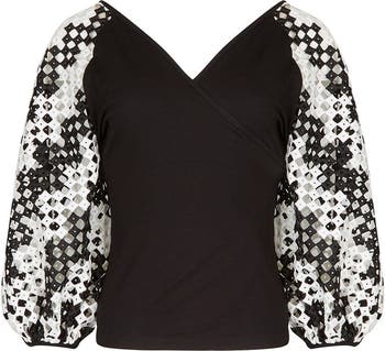 Women's Mirella Black V-Neck Top With Sheer Mesh Sleeves