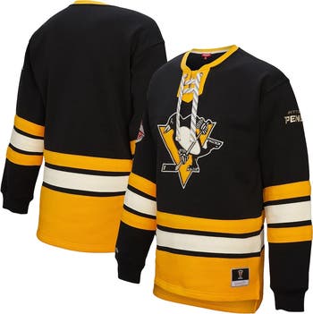 Stay warm in vintage style with this Pittsburgh Penguins Heritage Lace-Up Pullover Sweatshirt by Mitchell & Ness. Its embroidered team logo patches and sewn-on stripes provide a timeless look. A woven jock tag and lace-up neckline add sporty details, while the droptail hem with side splits gives this Pittsburgh Penguins sweatshirt a flattering and comfortable fit.