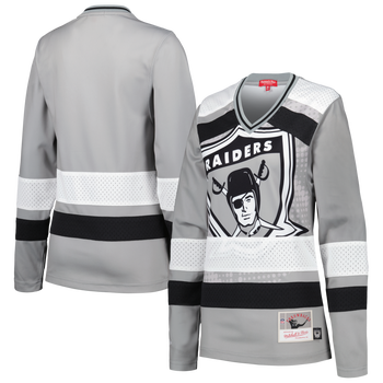 The Women's Mitchell & Ness Silver Las Vegas Raiders Big Face 7.0 Long Sleeve Jersey T-Shirt is the perfect way to show unwavering support for the Las Vegas Raiders. With its mesh overlay and sublimated graphics, this jersey-style tee captures the essence of the team's iconic uniforms. The woven jock tag and clip tag add a touch of authenticity, making it a must-have for any true Raiders fan.