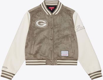 Show off your love for the Green Bay Packers with timeless style in this Full-Snap Varsity Jacket from Mitchell & Ness. Featuring smooth suede fabric with vintage-inspired graphics, this midweight jacket is built to protect you from the winter chill. The rib-knit details and side pockets combine for a durable and functional design, ensuring you stay comfortable and stylish while repping the Green Bay Packers all season long.
