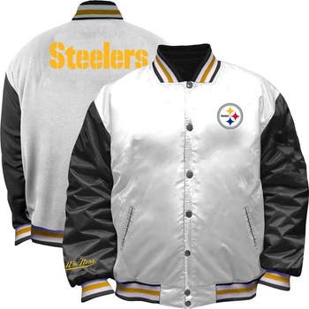 Show off your Pittsburgh Steelers pride with this Plus Size Full-Snap Satin Jacket from Mitchell & Ness. This satin jacket features embroidered graphics at the left chest, and an embroidered fabric applique wordmark on the back, showcasing your Pittsburgh Steelers pride in style. Its lightweight design makes it perfect for mild temperatures, while the rib-knit collar, hem, and cuffs ensure a snug, comfortable fit.