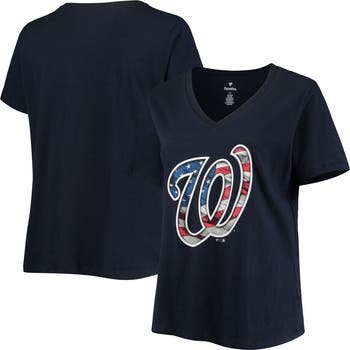 Celebrate your unwavering support for the Washington Nationals with the women's navy Washington Nationals plus size banner V-neck T-shirt. This cotton tee features bold screen print graphics that proudly display your allegiance to the Nationals. Whether you're cheering from the stands or simply showing your team spirit, this plus size T-shirt is the perfect way to represent the Washington Nationals in style.