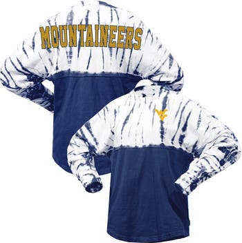 The Women's Navy West Virginia Mountaineers Tie-Dye Long Sleeve Jersey T-Shirt is a vibrant expression of your unwavering support for the West Virginia Mountaineers. Its unique tie-dye pattern and low-puff screen-print graphics create a bold and eye-catching look that will turn heads at every game. The oversized fit and dolman sleeves provide a comfortable and relaxed feel, perfect for cheering on your team from the stands or lounging at home.