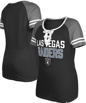 The New Era Women's Black Las Vegas Raiders Raglan Lace-Up T-Shirt is the perfect way to show your support for the Las Vegas Raiders. With raglan sleeves, a rounded hem, and screen-printed graphics, this t-shirt is both stylish and comfortable. Sewn-on stripes add a touch of team spirit, and the lightweight fabric makes it perfect for any occasion. Whether you're cheering on the Raiders at the stadium or relaxing at home, this t-shirt is sure to become a favorite.