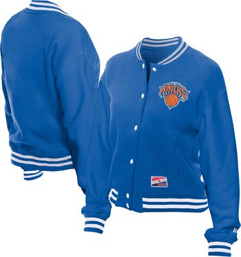 Rep your team in classic style with this New York Knicks Throwback Full-Snap Jacket from New Era. The fleece fabric provides a heavyweight feel, perfect for keeping you warm and comfortable on chilly gamedays. The team logo chenille patch is embroidered at the left chest, proudly showcasing your New York Knicks pride.