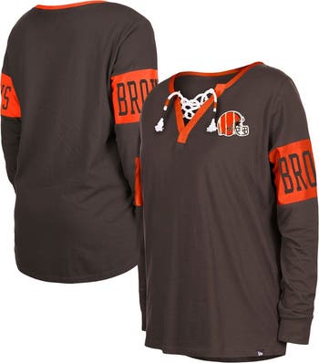 The New Era Women's Cleveland Browns Lace-Up Notch Neck Long Sleeve T-Shirt is a stylish and comfortable way to show your support for the Cleveland Browns. The notch neck with lace-up detail adds a touch of femininity, while the droptail hem with side splits provides a flattering fit. The screen-printed graphics proudly display the Browns logo, making this shirt a must-have for any Browns fan.