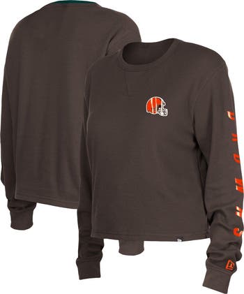 The Women's New Era Brown Cleveland Browns Thermal Crop Long Sleeve T-Shirt is the perfect way to show your unwavering support for the Cleveland Browns. This stylish and comfortable shirt features screen print graphics with foil details, a cropped hem, and a crew neck. Made from a soft cotton and polyester blend, this shirt is perfect for game day or any day you want to show your Browns pride.