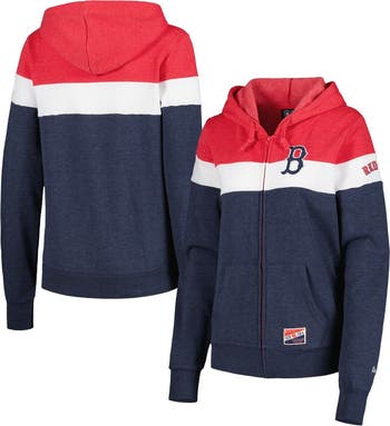 The Women's New Era Heather Navy Boston Red Sox Colorblock Full-Zip Hoodie Jacket is the perfect way to show your support for the Boston Red Sox. This midweight hoodie is made from a soft cotton and polyester blend, and features a fleece lining for added warmth. The contrast-color inset and embroidered graphics add a stylish touch, while the two front pockets provide plenty of storage space for your essentials. Whether you're cheering on the Red Sox at Fenway Park or just relaxing at home, this hoodie is sure to keep you comfortable and stylish.