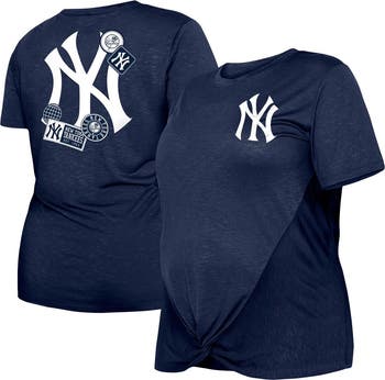 The Women's New Era Navy New York Yankees Plus Size Two-Hit Front Knot T-shirt is the perfect way to show your support for the New York Yankees. Made from a comfortable polyester and rayon blend, this t-shirt features a front knot at the bottom hem and heat-sealed graphics that proudly display your Yankees pride. Whether you're cheering at the stadium or just hanging out with friends, this t-shirt is sure to make you feel like part of the team.
