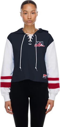 Brave the elements and show your US Hockey pride with the New Era Throwback Boxy Lace-Up Hoodie. From its contrast-color sleeves to the sewn-on stripes, this midweight hoodie offers a relaxed, boxy fit for ultimate comfort and style. An embroidered logo at the left chest and a woven brand tag at the bottom left hem complete this premium piece, making it a must-have for any dedicated fan.