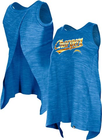 The New Era Women's Powder Blue Los Angeles Chargers Space Dye Active Tank Top is the perfect way to show your support for the Chargers. Made from a soft and breathable cotton-polyester blend, this tank top features screen print graphics that proudly display your team pride. The open back can be tied for a customizable fit, and the scoop neck adds a touch of style. Whether you're cheering on the Chargers at the stadium or just relaxing at home, this tank top is sure to become a favorite.