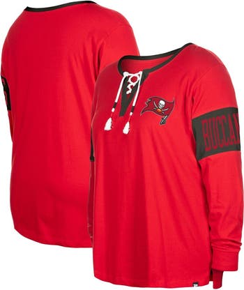 Celebrate your unwavering Tampa Bay Buccaneers fandom with the New Era Women's Red Tampa Bay Buccaneers Plus Size Lace-Up Notch Neck Long Sleeve T-Shirt. This stylish tee features a unique notch neck with lace-up detail, adding a touch of femininity to your game day attire. The droptail hem with side splits provides a flattering fit, while the screen print graphics proudly display your Tampa Bay Buccaneers pride. Whether you're cheering from the stands or simply showing your support, this T-shirt is the perfect way to represent your favorite NFL team.