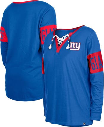 The Women's New Era Royal New York Giants Lace-Up Notch Neck Long Sleeve T-Shirt is a stylish and comfortable way to show your support for the New York Giants. The notch neck with lace-up detail adds a touch of femininity, while the droptail hem with side splits provides a flattering fit. The screen-printed graphics proudly display the New York Giants logo, making this t-shirt a must-have for any fan. Perfect for game day or a casual day out with friends, this t-shirt is the perfect way to represent your favorite team.