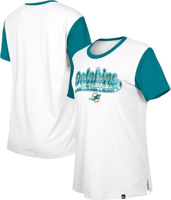 Run up the points on the fashion scoreboard with this Miami Dolphins 3rd Down T-Shirt. Miami Dolphins flair radiates throughout the trendy tee from the contrast color sleeves and collar to the plaid-inspired script graphics on the chest. Side vents add a panache of style to the New Era apparel and provide added circulation for those hot, sticky days.