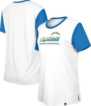 Celebrate your unwavering support for the Los Angeles Chargers with the New Era White/Blue Los Angeles Chargers Third Down Colorblock T-Shirt. This stylish tee features a vibrant colorblock design and bold screen print graphics that proudly display your Chargers pride. The side splits at the hem add a touch of flair, making it the perfect choice for game day or any day you want to show off your team spirit.
