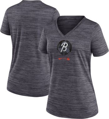 The Nike Women's Black Baltimore Orioles City Connect Velocity Practice Performance V-Neck T-Shirt is the ultimate way to show your unwavering support for the Baltimore Orioles. Crafted from a lightweight and breathable polyester blend, this shirt boasts screen-printed graphics that proudly showcase the iconic Orioles logo. Equipped with Dri-FIT technology, it ensures you stay cool and comfortable throughout the game, whether you're cheering from the stands or showcasing your skills on the field.