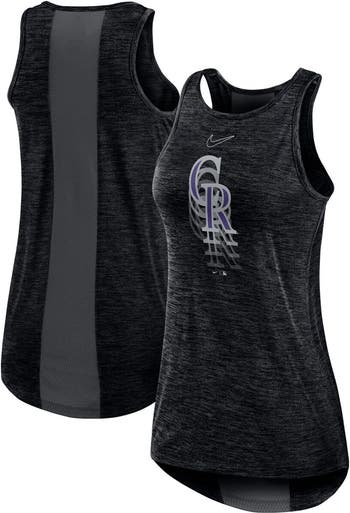 The Women's Nike Black Colorado Rockies Logo Fade High Neck Performance Tank Top is the perfect way to show your support for the Colorado Rockies. Made from breathable polyester, this tank top features a mesh panel at the back for extra breathability and a rounded droptail hem for a stylish look. The space-dye design adds a touch of flair, while the Dri-FIT technology helps keep you cool and dry. Whether you're cheering on the Rockies at the stadium or just showing your team spirit, this tank top is a must-have for any fan.