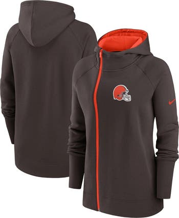 The Nike Brown Cleveland Browns Asymmetrical Raglan Full-Zip Hoodie is the perfect way to show your support for the Cleveland Browns. Made of cotton and polyester, this midweight hoodie offers comfort in moderate temperatures. Raglan sleeves and a scuba hood provide a stylish and comfortable fit. Embroidered graphics proudly display your Cleveland Browns pride. Whether you're cheering at the stadium or relaxing at home, this hoodie keeps you warm and stylish.