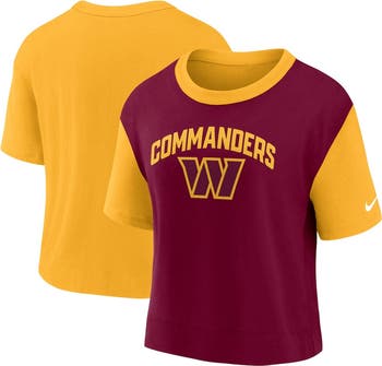 The Nike Gold/Burgundy Washington Commanders High Hip Fashion T-Shirt is the perfect way to show your support for the Commanders. This cropped tee features screen-printed graphics that proudly display your team pride. Made from soft cotton, this shirt is comfortable to wear all day long. Whether you're cheering on the Commanders at the game or just showing your support around town, this shirt is sure to turn heads.