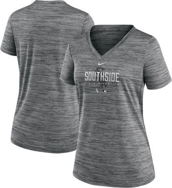 The Nike Gray Chicago White Sox City Connect Velocity Practice Performance V-Neck T-Shirt is the perfect way to show your support for the Chicago White Sox. Made from breathable polyester, this shirt features screen-printed graphics that proudly display the team's logo. Whether you're cheering from the stands or just showing your team spirit, this shirt is a must-have for any Chicago White Sox fan.