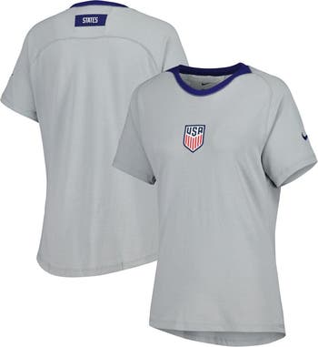 The Nike Gray USMNT Travel Raglan T-Shirt for women is the ultimate way to support the United States Men's National Soccer Team. Embroidered with bold USMNT graphics and featuring raglan sleeves, this shirt combines style and comfort. Crafted from soft and breathable cotton, it's perfect for any occasion, whether you're cheering at the stadium or relaxing at home. Show your unwavering USMNT pride with this exceptional T-shirt.