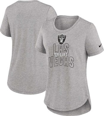 The Women's Nike Heather Gray Las Vegas Raiders Fashion Tri-Blend T-Shirt is the perfect way to show your support for the Las Vegas Raiders. Made from a soft and comfortable tri-blend of polyester, cotton, and rayon, this t-shirt features distressed screen print graphics that give it a vintage look. The rounded droptail hem adds a touch of style, while the Las Vegas Raiders logo proudly displayed on the front shows your team spirit. Whether you're cheering on the Raiders at the stadium or just relaxing at home, this t-shirt is sure to become a favorite.