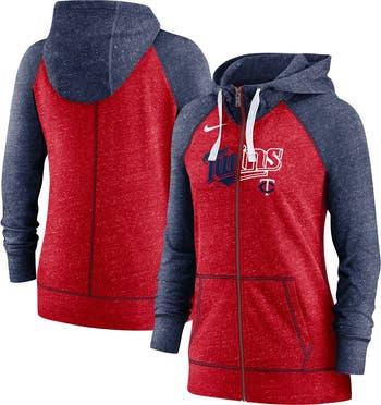 The Women's Nike Heather Red/Heather Navy Minnesota Twins Split Wordmark Gym Vintage Raglan Lightweight Full-Zip Hoodie is the perfect way to show your support for the Minnesota Twins. Made from a lightweight cotton and polyester blend, this hoodie is ideal for mild temperatures. Raglan sleeves and two front pockets provide comfort and functionality, while flatlock stitching ensures durability. Whether you're cheering on the Twins at the stadium or relaxing at home, this hoodie will keep you comfortable and stylish.