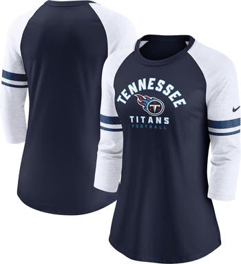 Celebrate your unwavering Tennessee Titans spirit with the Women's Nike Navy Tennessee Titans 3/4-Sleeve Lightweight Raglan Fashion T-Shirt. Its raglan sleeves and screen-printed graphics proudly display your allegiance to the Tennessee Titans, while the rounded hem adds a touch of style. Whether you're cheering from the stands or simply showing your support, this T-shirt is the perfect way to represent the Tennessee Titans and the NFL.