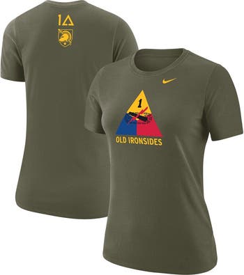 Celebrate your unwavering support for the Army Black Knights with the Women's Nike Olive Army Black Knights 1st Armored Division Old Ironsides Operation Torch T-shirt. Crafted from a breathable cotton and polyester blend, this T-shirt proudly displays the Army Black Knights logo, honoring the legacy of the 1st Armored Division and their heroic role in Operation Torch. Whether you're cheering from the stands or simply showing your Army Black Knights pride, this T-shirt is the perfect way to represent your team and the spirit of the College.