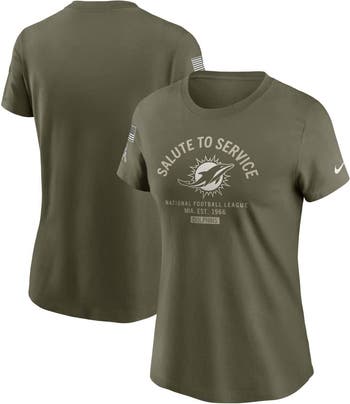 Join the Miami Dolphins in supporting those who bravely serve our country with this 2025 Salute to Service Sideline T-Shirt by Nike. It replicates the military-inspired design and American flag patch the team wears. Lightweight jersey fabric keeps you cool and comfortable in this meaningful Miami Dolphins tee. The NFL does not profit from the sale of Salute to Service products. Charitable contributions are awarded by the NFL Foundation to the NFL's Salute to Service nonprofit military partners.