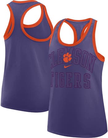 Stay cool and comfortable while reppin the Clemson Tigers in this Primetime Tri-Blend Racerback Tank Top by Nike. It features an eco-conscious design crafted from a blend of recycled polyester and organic cotton. Lightweight jersey fabric offers a soft and breathable feel, making this Clemson Tigers top ideal for hot weather.