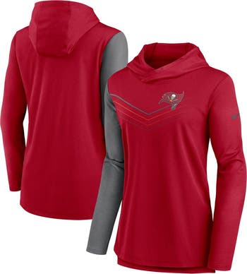 The Nike Women's Red/Heathered Charcoal Tampa Bay Buccaneers Chevron Hoodie Performance Long Sleeve T-Shirt is the ultimate way to show your unwavering support for the Tampa Bay Buccaneers. Made from breathable polyester, this long sleeve T-shirt features Dri-FIT technology to keep you cool and comfortable during the game. The overlapping hood without a drawstring and thumbholes on the sleeves provide added comfort and warmth. The screen print graphics proudly display the Tampa Bay Buccaneers logo, making this T-shirt a must-have for any true fan.