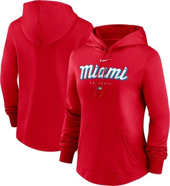 The Women's Nike Red Miami Marlins City Connect Pregame Performance Pullover Hoodie is the perfect way to show your support for the Miami Marlins. Made from a comfortable polyester and spandex blend, this midweight hoodie is suitable for moderate temperatures and features heat-sealed graphics that proudly display your Marlins pride. The front pouch pocket provides convenient storage for your essentials, while the rounded droptail hem adds a stylish touch. Whether you're cheering on the Marlins at the stadium or just relaxing at home, this hoodie is sure to keep you comfortable and stylish.