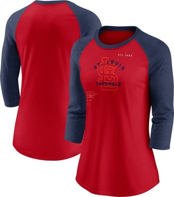 The Women's Nike Red/Navy St. Louis Cardinals Next Up Tri-Blend Raglan 3/4-Sleeve T-Shirt is the perfect way to show your support for the St. Louis Cardinals. Made from a comfortable polyester, cotton, and rayon blend, this shirt features raglan sleeves and a rounded hem for a relaxed fit. The screen print graphics proudly display the St. Louis Cardinals logo, making it a must-have for any Cardinals fan.