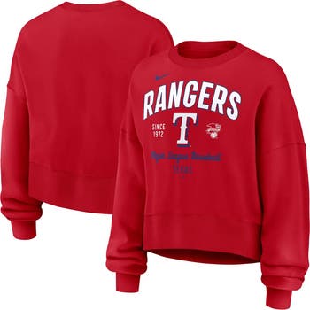 Stay comfy in fashionable Texas Rangers apparel with this Oversized High Hip Pullover Sweatshirt by Nike. It features dropped shoulders and scrunched sleeves for a trendy look and relaxed fit. Brushed French terry fabric and fleece lining provide exceptional warmth and a luxuriously soft feel, making this Texas Rangers sweatshirt perfect for cooler game days or casual outings.
